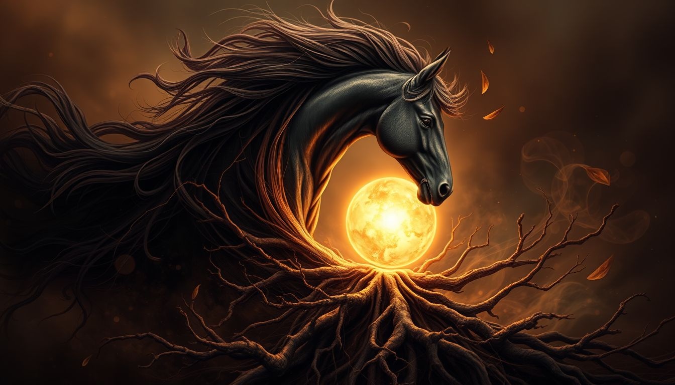 Een donkerbruin paard dat transformeert symboliseert innerlijke transformatie en verborgen kracht die ontwaakt in je ziel.