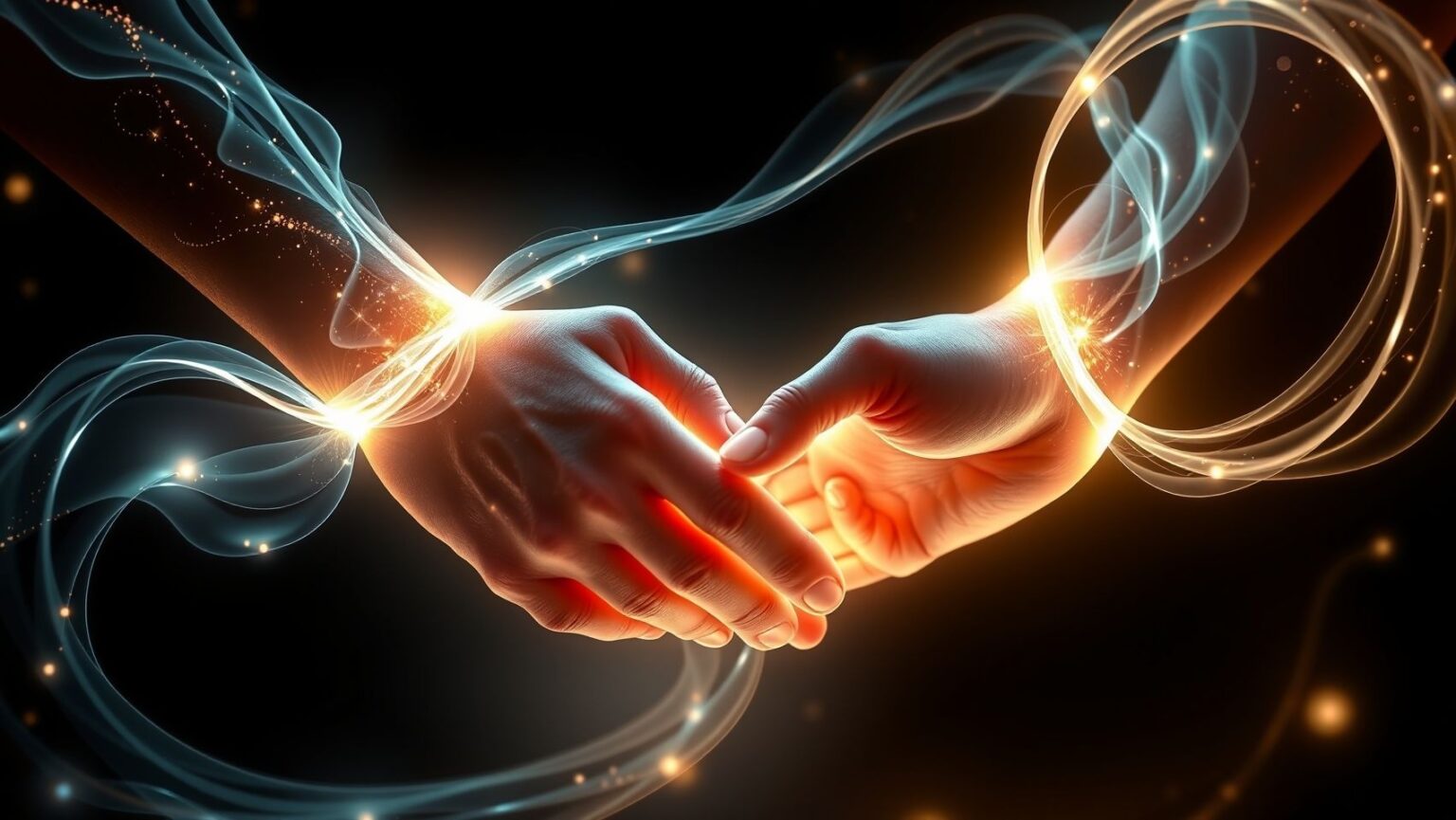 Een handdruk met warme handen in een droom symboliseert diepe verbondenheid en het helende krachtveld tussen zielen.